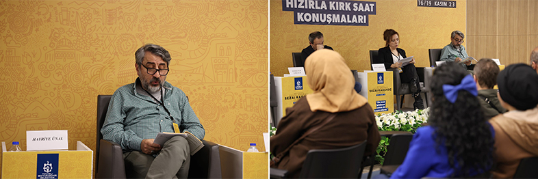 Karakoç’un Hızırla 40 Saat şirinin sekizinci bölümünü okuyarak konuşmasına başlayan yazar Hayriye Ünal ise ardından parçalardaki detayları anlattı. Ünal, “Tarihte kaybedilen ve kaybedilmeyenler var. Boşlukları kurgular kapatıyor. Sezai Karakoç’un tüm şiirleri uzun ömürlü ve genişletilmiş. Hızırla 40 Saat şiiri de buna uyuyor. İnşa etmek istediği dünya açısından da insanların ilk benliğine döndürüyor. Karakoç şiirinde hızır dışında doğanın unsurlarını da çağırıyor. Tanıklarını doğadan seçiyor. Yazarken keşfeden bir sanatçı” diye konuştu.