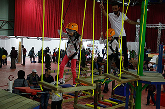 <p>Alanın diğer zor ve eğlenceli atölyesi Macera Parkuru. Parkurda yarışacak çocuklara öncelikle emniyet kemeri ve kask takılıyor. Çocuklar güvenlik aparatlarının takılmasından sonra parkurda yarışmaya başlıyorlar. Yarışmada çocuklar, yüksek oyun, ip parkuru, sallanan ip, zig zag, renkli basamak, uçan küpler, sallanan köprü, çapraz silindir ve gemici geçişi etaplarını geçtiler.</p>