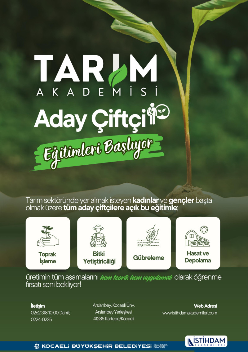 Tarım Akademisi, tarım alanında temel bilgiye sahip çiftçi kayıt sisteminde kayıtlı olan kursiyerlere daha ileri düzey eğitim vererek uzmanlık kazandırmayı hedefliyor. Eğitimler arasında “Aday Çiftçi Eğitimi”, “Arı Yetiştiriciliği”, “Mantar Yetiştiriciliği”, “Sebze Yetiştiriciliği” ve “Üzümsü Meyve Yetiştiriciliği” gibi spesifik branşlar yer alıyor. Kocaeli Üniversitesi Arslanbey Yerleşkesi’nde kurulacak olan akademi; tarımsal üretim, bitki yetiştiriciliği, tarımsal teknoloji ve pazarlama gibi farklı alanlarda kurs ve uygulama saha imkânı sağlayacak.