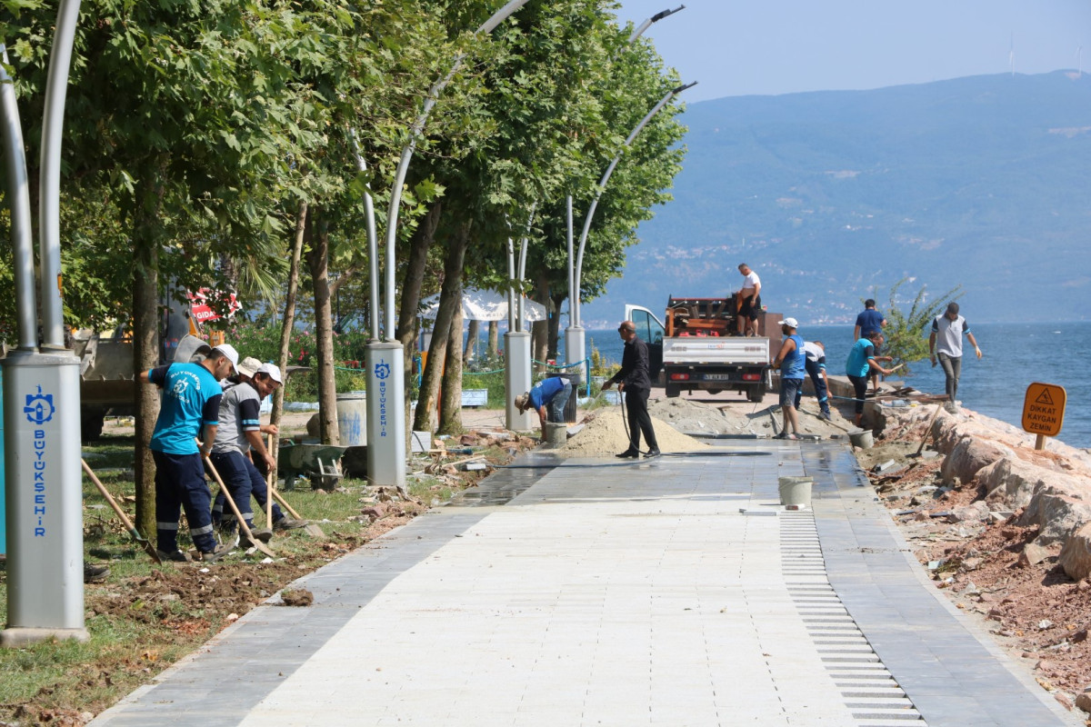 Park ve Bahçeler Dairesi Başkanlığı ekipleri tarafından yürütülen çalışmalar kapsamında deniz kıyısında yapılan 600 metrelik taş tahkimatın onarımı ve yapımı tamamlandı. Deniz taşmasından dolayı sahil parkında bulunan yürüyüş yolunun 500 metrelik kısmındaki yenileme çalışması ise en kısa sürede bitirilecek.