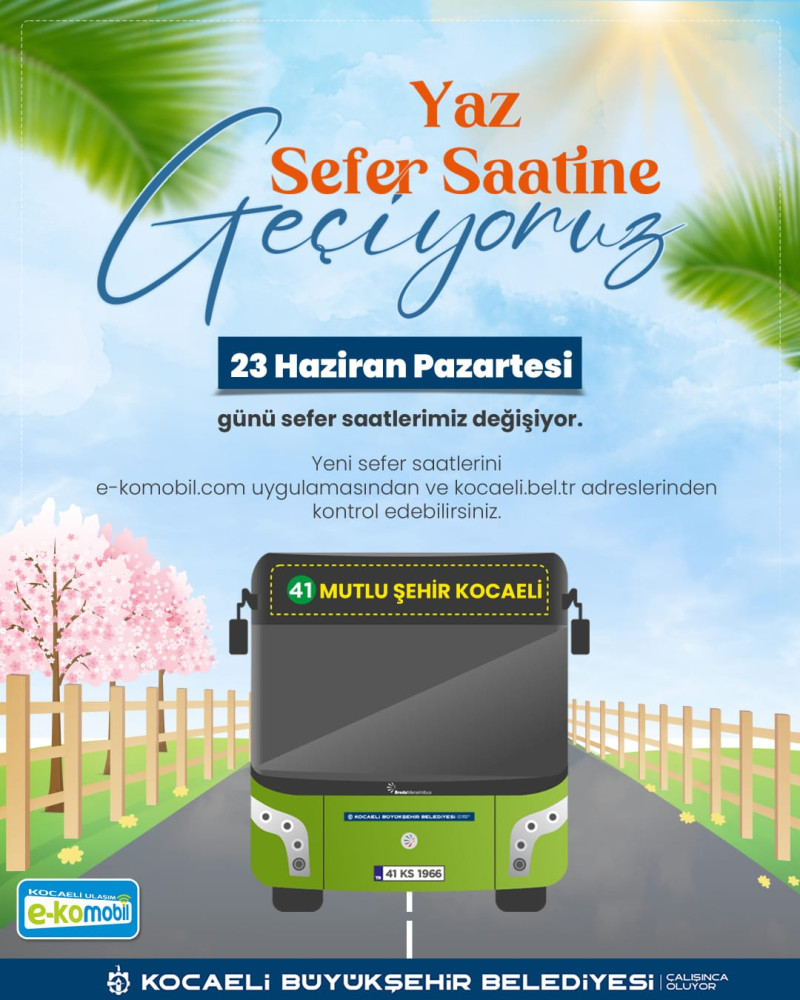 Kocaeli Büyükşehir Belediyesi, 23 Haziran Pazartesi gününden itibaren otobüs ve tramvaylarda yaz sefer saati uygulamasına geçiyor. Güncel tarifeler www.e-komobil.com ve www.kocaeli.bel.tr adreslerinden ulaşılabilecek.