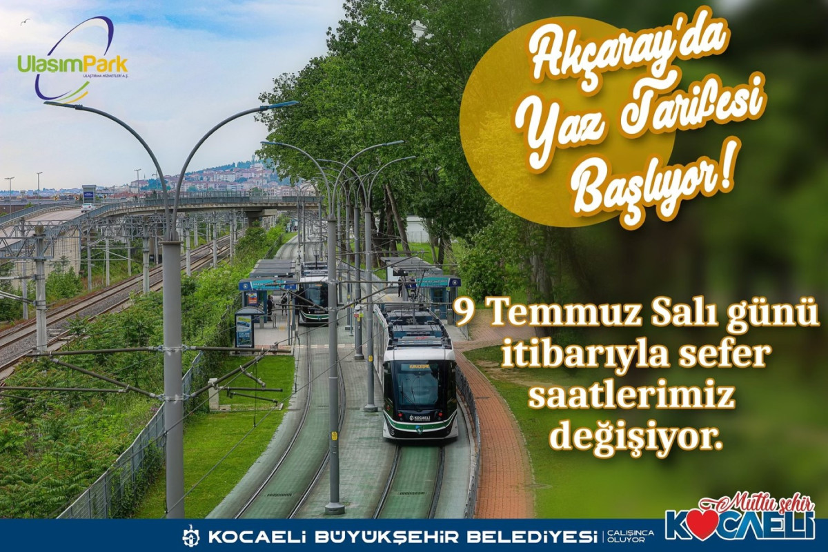 Kocaeli Büyükşehir Belediyesi iştiraklerinden UlaşımPark A.Ş. tarafından işletmesi gerçekleştirilen Akçaray tramvayı, 09 Temmuz 2024 (bugün) itibariyle yaz sefer saatleri uygulamasına geçti. Yaz tarifesinde Otogar-Kuruçeşme arasında yapılan seferler 24.00’ten 01.00’e, Kuruçeşme-Otogar arasındaki seferler ise 00.30’dan 01.30’a kadar uzatıldı. Yoğun saatlerde 5 dakikada bir geçen tramvay araçlarıyla Kocaelililer bu yaz da hızlı, güvenli ve konforlu bir yolculuk imkânı bulacak.