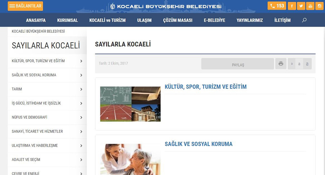 Kocaeli Büyükşehir Belediyesi web sitesinin Kocaeli ve Turizm sekmesi altında erişime açılan yeni bölüm; Kültür, Spor, Turizm ve Eğitim, Sağlık ve Sosyal Koruma, Tarım, İş gücü, istihdam ve İşsizlik, Nüfus ve Demografi, Sanayi, Ticaret ve Hizmetler, Ulaştırma ve Haberleşme, Adalet ve Seçim, Çevre ve Enerji, Yatırımlar ve Dış ticaret konularında vatandaşlara istatistiki bilgileri ulaştırıyor. https://www.kocaeli.bel.tr/tr/main/pages/sayilarla-kocaeli/101 linkinden “Sayılarla Kocaeli” sayfasına erişebilirsiniz.