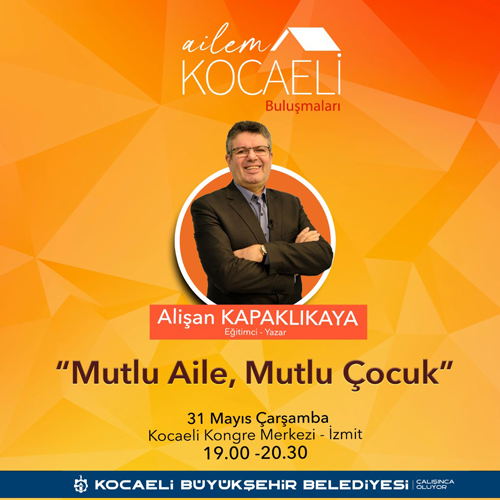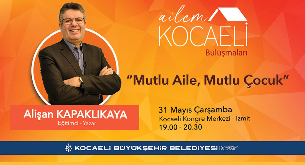 Kocaeli Büyükşehir Belediyesi, Ailem Kocaeli Buluşmaları kapsamında sevilen yazarları vatandaşla buluşturmaya devam ediyor. 31 Mayıs Çarşamba günü saat 19.00’da Kocaeli Kongre Merkezi Akçakoca Salonunda gerçekleşecek söyleşide eğitimci-yazar Alişan Kapaklıkaya, ‘Mutlu Aile Mutlu Çocuk’ konusu ile Kocaelililerle buluşacak. Ücretsiz gerçekleşecek programda çocuklar da güvenli oyun alanlarında doyasıya eğlenebilecek.
