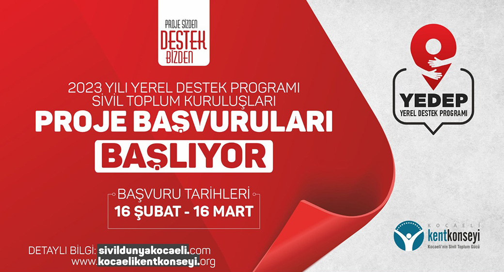 Kocaeli Büyükşehir Belediyesi desteğiyle, Kocaeli Kent Konseyi tarafından yürütülen, toplum temelli yapılan çalışmaların uygulanması ve yerel düzeyde sürdürülebilir bir kalkınma sağlaması amacıyla başlatılan Yerel Destek Programında (YEDEP) 2023 yılı proje hibe başvuruları başlıyor. Hibe programı için proje başvuruları 16 Şubat 2023 tarihinde başlayıp, 16 Mart 2023’te sona erecek.