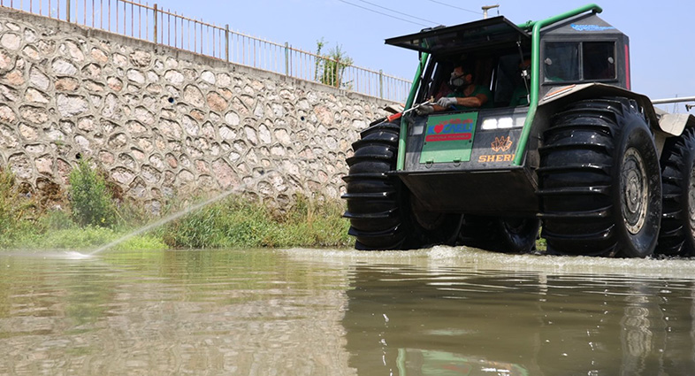 Büyükşehir’in vektörle mücadelede kullandığı hem karada hem denizde hareket kabiliyetine sahip araçla 3 günlük ilaçlama yarım günde tamamlanıyor