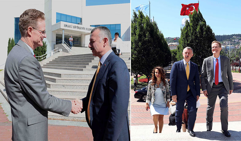 Marmara Belediyeler Birliği ve Kocaeli Büyükşehir Belediye Başkanı Doç. Dr. Tahir Büyükakın, Almanya’nın İstanbul Başkonsolosu Johannes Regenbrecht’i makamında konuk etmesinin ardından bu seferde Avrupa Birliği (AB) Türkiye Delegasyonu Başkanı Büyükelçi Nikolaus Meyer-Landrut’u konuk etti. Kocaeli’ni tanımak için ayrı bir gayretinin olduğunu ziyaretinde dile getiren Büyükelçi Meyer, SİEMENS gibi firmaların yanı sıra iş dünyasıyla bir araya geldiğini de ifade etti. ‘’Şehrimize hoş geldiniz’’ diyen Başkan Büyükakın, Kocaeli’nin Türkiye açısından üretim, bilişim, lojistik gibi birçok alanda önemi hakkında konuk Büyükelçiyle görüş alışverişi yaptı.