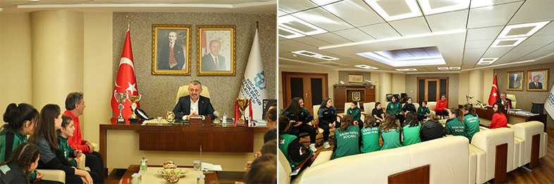 Kocaeli Büyükşehir Belediye Başkanı Tahir Büyükakın, Kadınlar 1. Liginde mücadele eden ve alt yapılarında 500’e yakın sporcu bulunduran Kocaeli Bayan Futbol Takımını makamında konuk etti. Anadolu Yıldızlar Ligindeki Türkiye Şampiyonu sporcularıyla da yakından ilgilenen Başkan Büyükakın, “Şehrimizin kızlarının aldığı başarılar bizi çok mutlu ediyor. Onlarla gurur duyuyoruz. Alt yapılarda spor yapan ve futbol oynayan yavrularımızın varlığı çok kıymetli. Bu başarıların yanında spor kültürüyle büyüyen çocuklarımız ve gençlerimiz, geleceğin sağlıklı bireyleri de olacak. Bakınız, sentetik futbol sahalarımızı şehrimizin her köşesine kazandırdık. Basketbol ve voleybol sahalarını okullarımız sayesinde mahallelere kadar yaydık. Hayata geçirdiğimiz spor salonlarıyla da çocuklarımıza, gençlerimize ve her yaştan insanımıza hizmet veriyoruz” dedi.
