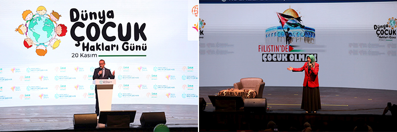 Konuşmaların ardından Büyükşehir Belediyesi Anne Şehir Merkezleri Çocuk Hizmetleri birimi tarafından yürütülen çocuk atölyelerinden drama atölyesi derslerine katılan çocuklar, “çocuk hakları ilkeleri” sunumlarını ve şiirleri okudu. Çocuklar, ‘’Savaşsız bir dünya istiyoruz’’ dedi. Ardından eğitimci-yazar Merve Gülcemal sahne aldı. ‘Filistin’de Çocuk Olmak’ konulu masal anlatısında Gülcemal, “Çocuklar, büyükler sizlere güzel bir gelecek bırakmak için çalışıyor. İnşallah savaşsız bir dünya bırakacağız size. Biz kazanacağız. Neden. Allah her zaman iyilerle birliktedir. Biz iyiler tekrar dünyayı yöneteceğiz” sözlerini sarf etti.