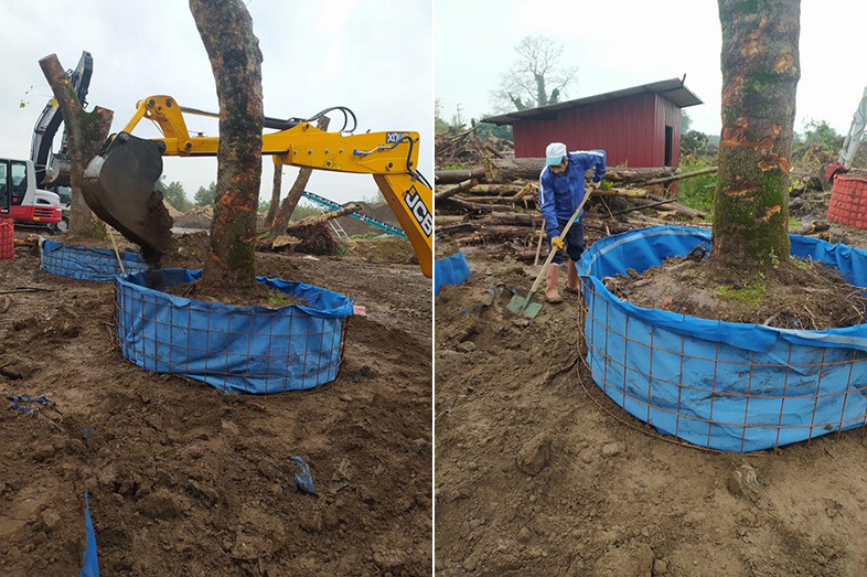 Köklerin hava almasını engelleyen koruma çalışmalarında bitkinin kendini toparlaması için budaması gerçekleştiriliyor. Böylece su dolaşımının bitkiyi toparlaması, daha çabuk hayata geçirmesi sağlanıyor. Kök temizliği de yapılan bitkiler özel karışımlı toprak ile saksıya veya rehabilitasyon alanlarına alınıyor. Dikime hazır hale gelen bitkiler ihtiyacı olan bölgelere dikilmek üzere beklemeye alınıyor. Ağaçlar bu şekilde yeniden yeşillendirilip, toprakla buluşması sağlanıyor.
