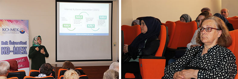 Leyla Atakan Kültür Merkezinde verilen ilk eğitim yaklaşık 2,5 saat sürdü. Eğitimde çınarlarımızın akıllı telefon, tablet, bilgisayar gibi cihazlar ile günlük hayatlarını kolaylaştıracak kadar bilinçli internete erişimleri konusunda soru cevaplı söyleşi gerçekleştirildi.