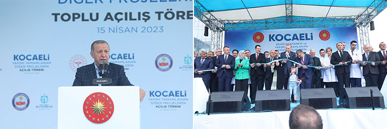 Şehir hastanesinin yanı sıra 11. Toplu Açılış Törenine de değinen Cumhurbaşkanı Erdoğan, ‘’Bugün kurumlarımızın ve belediyelerimizin tamamladığı çok sayıda yatırımın açılışını yapıyoruz. Kocaeli Büyükşehir Belediyemizin şehrimize kazandırdığı, yatırım tutarı 1,7 milyar lirayı geçen 40 projesinin resmi açılışını yapıyoruz. Kocaeli Büyükşehir Belediyemizin halen yapımı süren yaklaşık 4 milyar liralık yatırımı daha var, inşallah onları da en kısa sürede hizmete sunacağız. İzmit Körfezinin temizliği, Kartepe Teleferik Projesi, millet bahçesi, Gebze-Darıca metro hattı, tramvay hattı ve altyapıdan oluşan bu yatırımları yakından takip ediyoruz. Yine bugün ilçe belediyelerimizin de yatırımlarını hizmete açıyoruz. Böylece şehir hastanemiz hariç kurumlarımızın ve belediyelerimizle toplamda 2,3 milyar liralık bir yatırmı şehrimize kazandırıyoruz. Son 20 yılda Kocaeline 150 milyar liranın üzerine yatırım yaptık’’ bilgisini verdi.