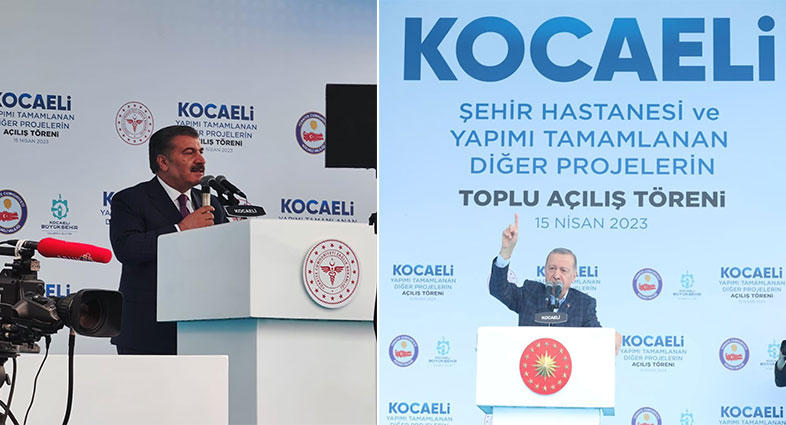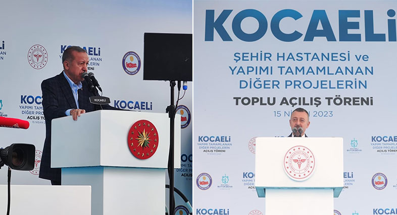 Yoğun bir katılım ve coşkulu bir tezahürat eşliğinde sözlerine başlayan Cumhurbaşkanı Erdoğan, ‘’Kocaelinin güzel insanları, başımızın tacı kıymetli hanımlar, geleceğimizin teminatı sevgili gençler, sizi hürmetle selamlıyorum. Şu muhteşem katılıma bak. Bugün yine adı Koca, gönlü yüce, tabiatın ve tarihin şehri Kocaeli’nin tüm güzel insanlarına selamlarımı gönderiyorum. Kocaeli Şehir Hastanesiyle diğer yatırımlarımızın hayırlı olmasını diliyorum. Bir zamanlar neydi hastanelerimizin hali, hastalarımız rehin alınır veya rehine alınırdı. Hatırlıyosunuz o günleri di mi, kimdi o zaman SSK’nın başında?’’ ifadesini kullandı.