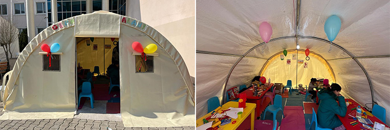 Kocaeli Büyükşehir Belediye Başkanı Tahir Büyükakın, Kahranmaraş’ta yaşanan iki büyük depremin ardından sarsıntılardan en çok etkilenen yerlerden olan Hatay’ın Defne ilçesinde görevlendirilmişti. Başkan Büyükakın ve beraberindeki ekibin ilçeye ayak basmasından bu yana depremin yaralarının sarılması için çok önemli adımlar atıldı. Arama kurtarma, alt yapı, içme suyu, gıda, çadır kent ve sahra hastanesi çalışmaları devam ederken, depremden en çok etkilenen çocukların oyunla iyileştirilmesi için de Defne’de ilk olarak Necmi Asfuroğlu Anadolu Lisesi’nin bahçesinde özel bir çadır hazırlandı.