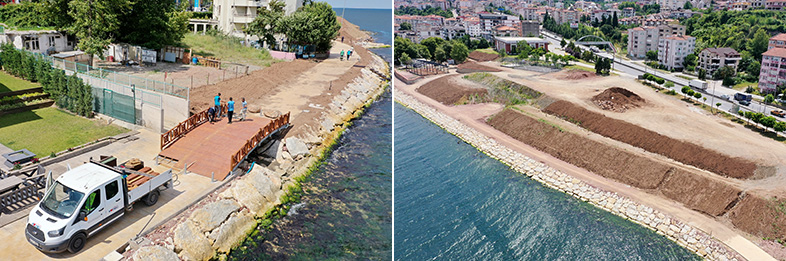 Kocaeli Büyükşehir Belediyesi’nin İzmit Körfezi’ni gerdan gibi saran sahil düzenlemeleri çalışmaları tüm hızıyla devam ediyor. Gölcük Değirmendere-Halıdere arasındaki çalışmalarda Halıdere tarafında çalışmalar bitirilirken, Değirmendere tarafında ise sona yaklaşıldı. İlk çalışmalara ekim ayında başlanmıştı, çalışmaların büyük bir kısmı tamamlandı. Değirmendere tarafında yapılması planlanan Aquapark projesi sözleşme aşamasında olduğundan yakın zamanda imalata başlaması hedefleniyor.