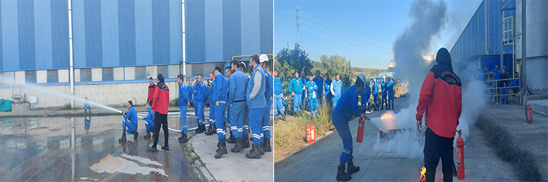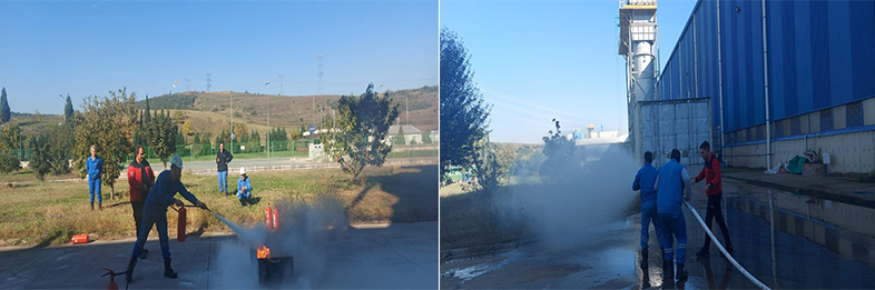 Eğitimin uygulamalı bölümünde, taşınabilir yangın söndürücüleriyle başlangıç yangınlarının söndürülmesi ve hortum dolapları ile hidrant kullanımı hakkında bilgiler sunuldu. Bu bağlamda işletmede bulunan Kuru Kimyevi Tozlu, Karbondioksitli ve Köpüklü taşınabilir yangın söndürücüler ile akaryakıt yangınına müdahale gerçekleştirildi. Ayrıca eğitimde, hidrant kullanımı, hidrantlardan hortum hattı oluşturulması, lanslar ve lansların doğru kullanımı ile su akımları ilgili personele uygulamalı olarak gösterildi.
