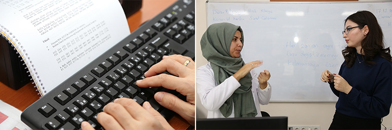 Demet Atasoy, İstanbul’da olmadığı için her gün yüzlerce kilometre yol kat ederek KO-MEK’te işitme engelli bireyler için Hızlı Klavye Kursu eğitimi alıyor.