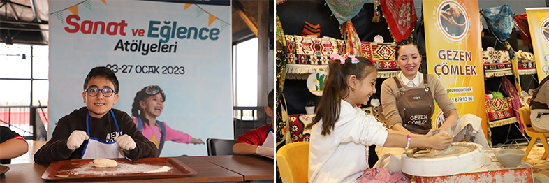 Tatili hak eden öğrenciler Kongre Merkezi’ndeki salonlarda ilk gün içinde panç yapımı, ağaç dilimi boyama, makrome anahtarlık, kağıt kıvırmadan tablo yapımı, cam altı resim, kaşık kukla ve ıhlamur baskı etkinliklerine katıldı. Ayrıca Selim Sırrı Paşa Salonu’nda köy seyirlik oyunlarını, Çoban Mustafa Paşa Salonu’nda ise Türk Dünyası Çocuk Oyunlarını izleyen çocuklar, masal mühür ile masal sikke atölyesinde hayal dünyalarından kendileri adına betimledikleri mühür ve sikkelerini yaptılar.